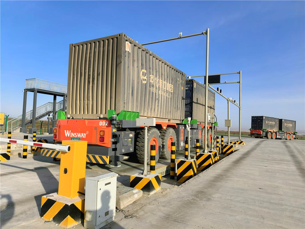 满都拉口岸AGV无人驾驶跨境运输车辆有序运行。