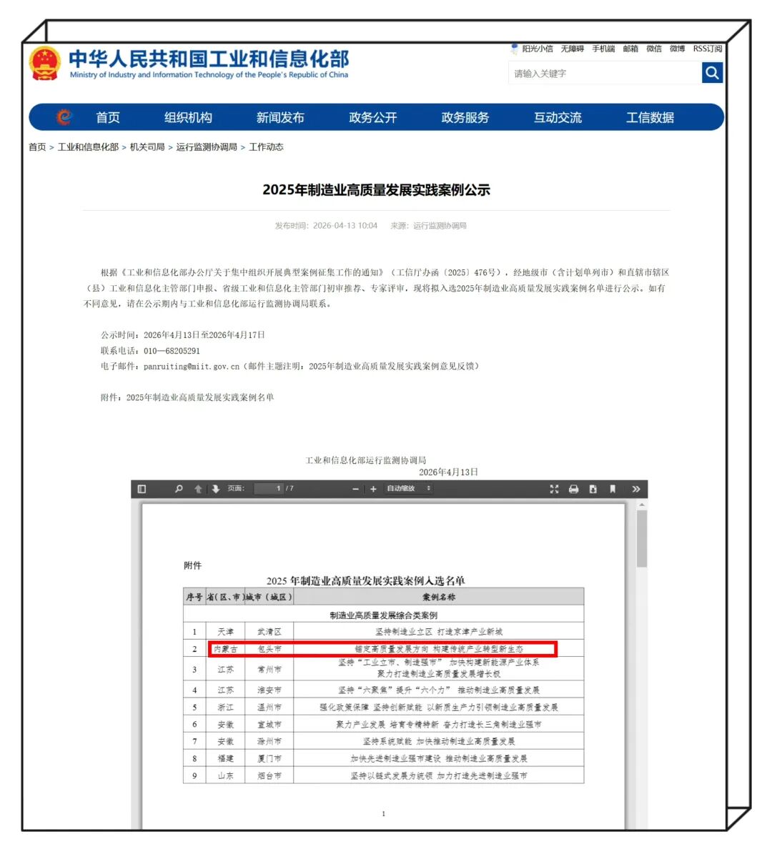 工信部近日公示2025年制造业高质量发展实践案例名单,全国共入选71个制造业高质量发展实践案例。其中,包头市工信局报送的《锚定高质量发展方向 构建传统产业转型新生态》入选综合类案例,为内蒙古自治区唯一入选案例。