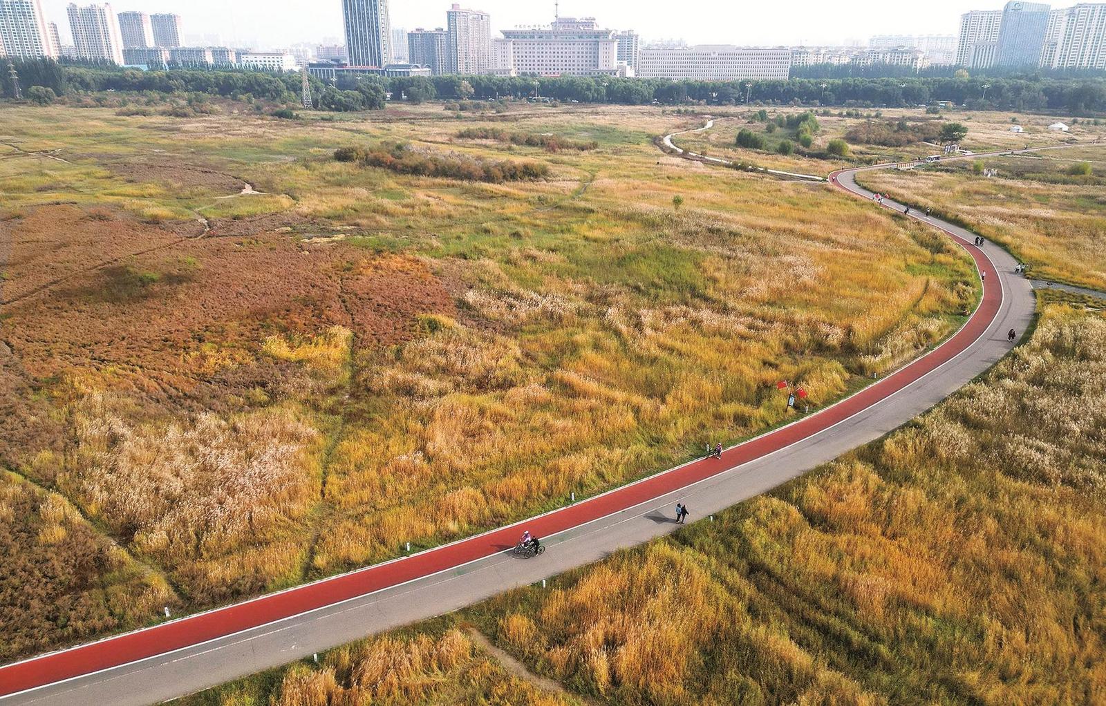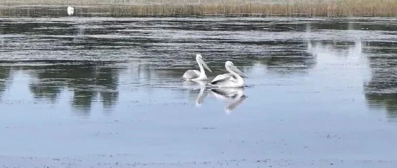 在共中海湖面上,工作人员用视频记录了这2只卷羽鹈鹕的优美身影,它们在湖面俯身觅食,随后振动宽大的翅膀缓缓飞离水面,翱翔空中,翩跹舞动,为秋日的湿地增添了灵动色彩。