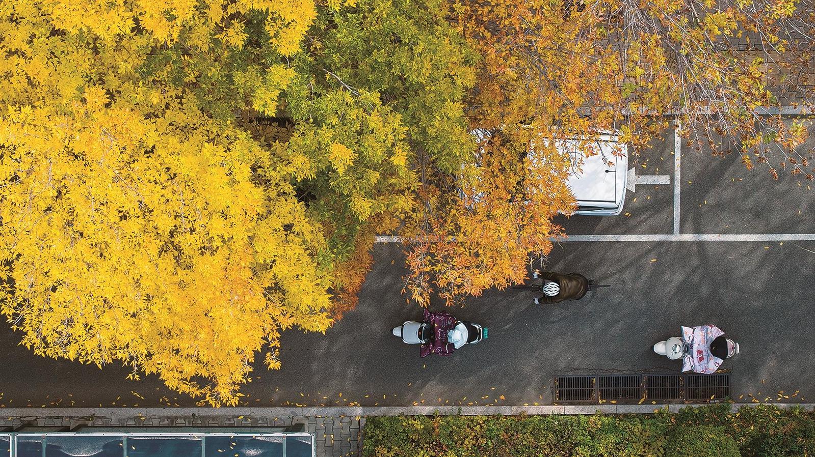 最近几天,受较强冷空气影响,包头气温骤降,最低气温跌破0℃。10月18日清晨,外出的行人从街头金黄色的树叶下经过,行人纷纷换上厚外套、帽子和手套,电动车也加装上了防风保暖装备,抵御深秋的寒意。