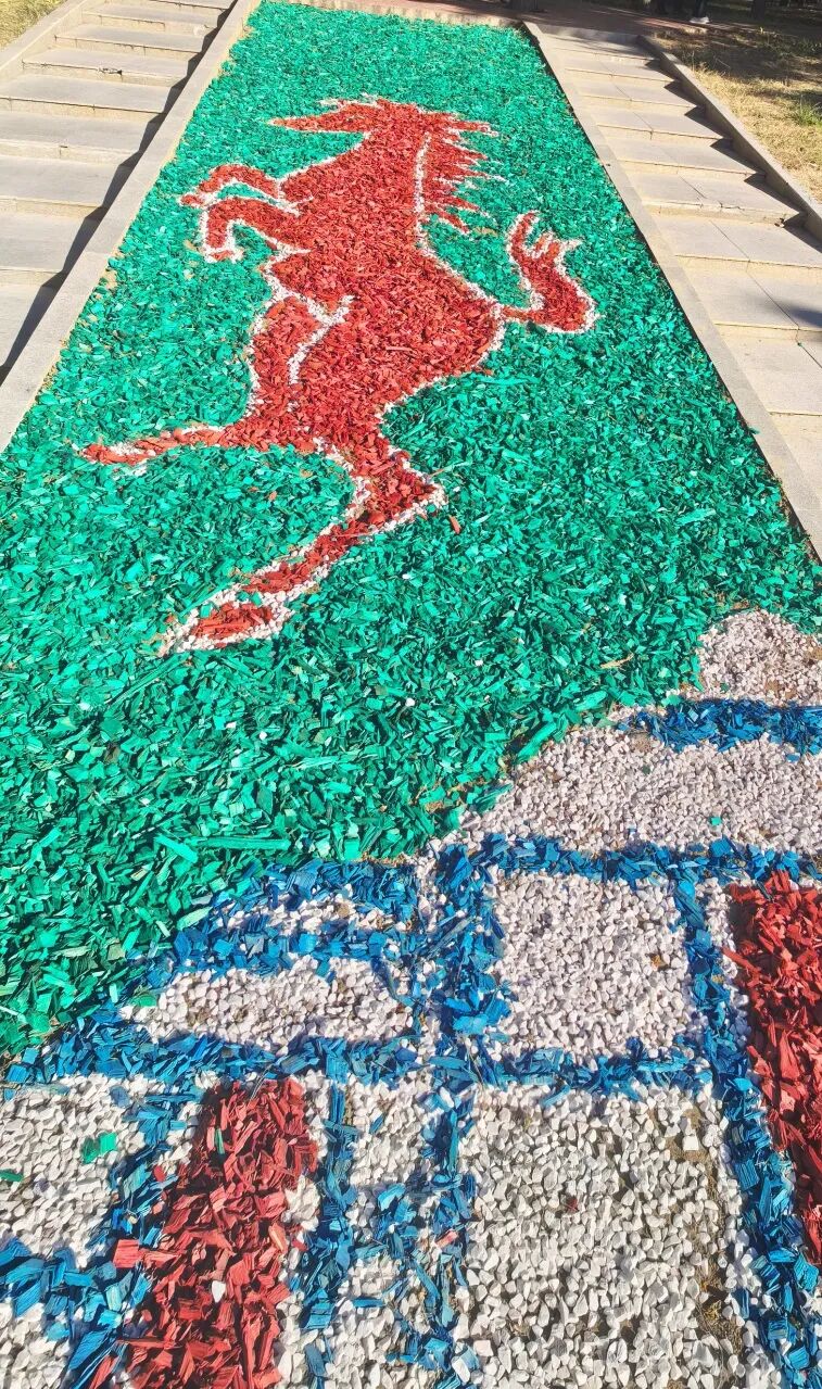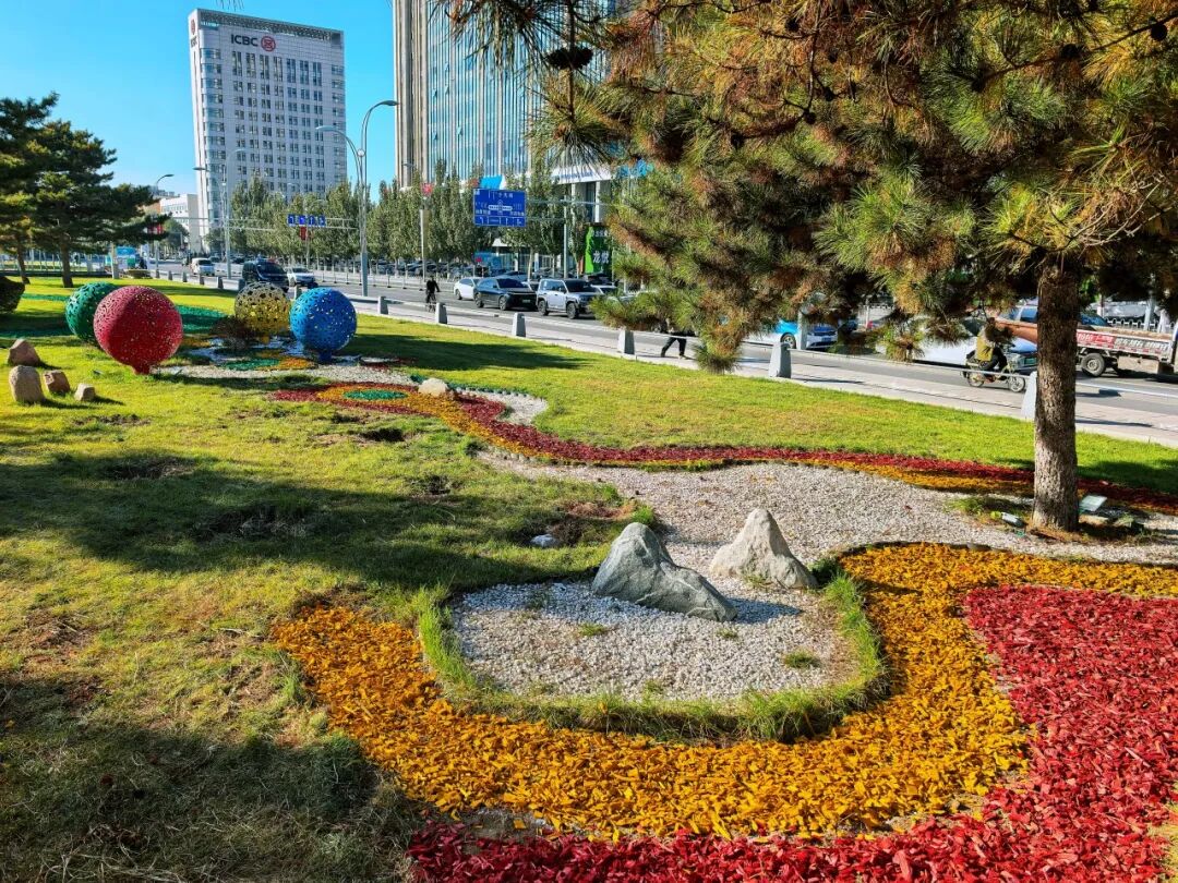 在银河广场,今年的设计格外引人注目。据工作人员介绍,此次铺设突破了传统单一覆盖模式,巧妙融入了中国传统云纹、蒙古包等文化元素,更特别以“马”为核心意象,呼应即将到来的农历马年,传递吉祥如意的美好祝福。色彩与白石子的和谐搭配,银杏叶、枫叶、榆树叶等自然造型的点缀,再结合花钵中的立体装饰,共同构建出一幅兼具传统韵味与现代美感的城市画卷,为寒冷季节注入融融暖意与生动气息。