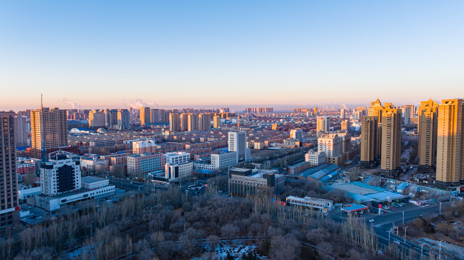 冬日清晨,城市沐浴在旭日暖阳中。朝阳金色的光芒照得楼宇焕发生机,街巷车流有序穿梭,勾勒出一幅朝气蓬勃、欣欣向荣的城市律动图景。