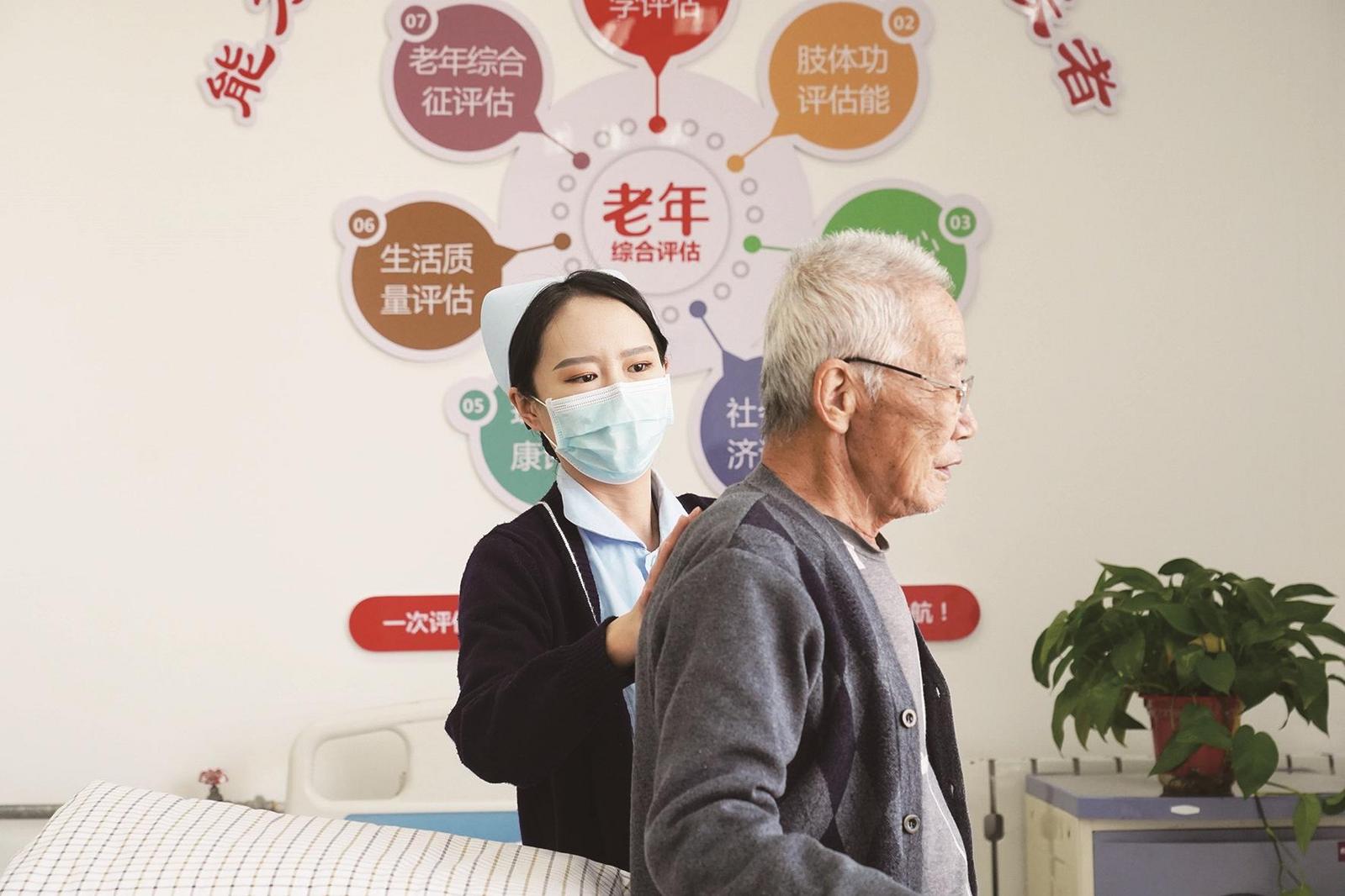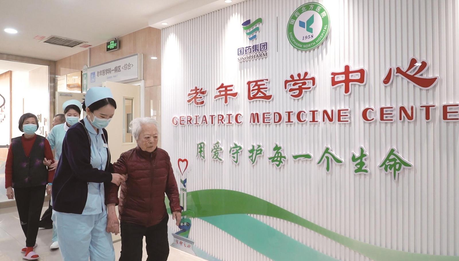 国药北方医院老年医学科医护人员照顾老人。