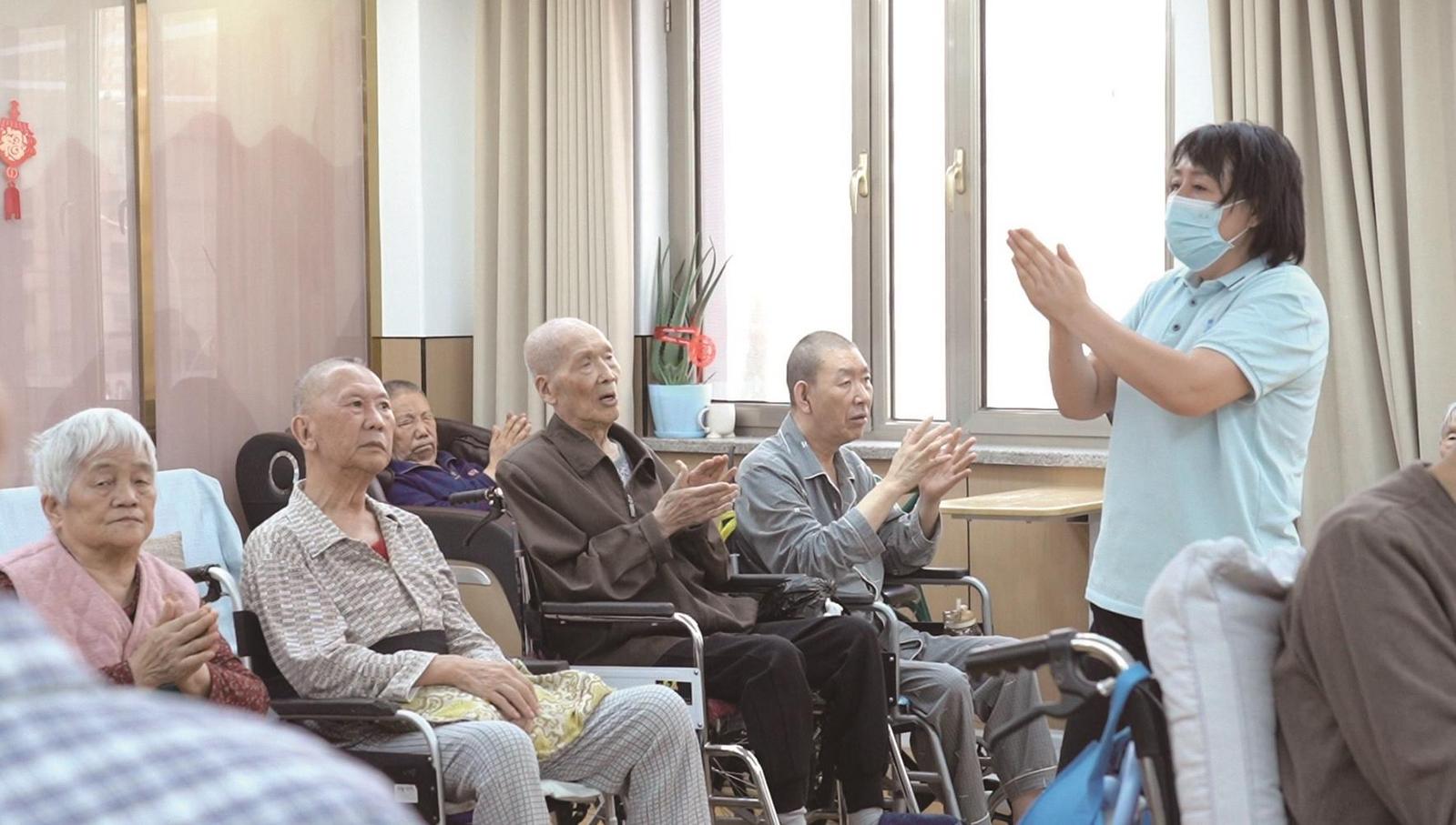 包钢三医院临家照护中心医护人员带领老人做拍手操。