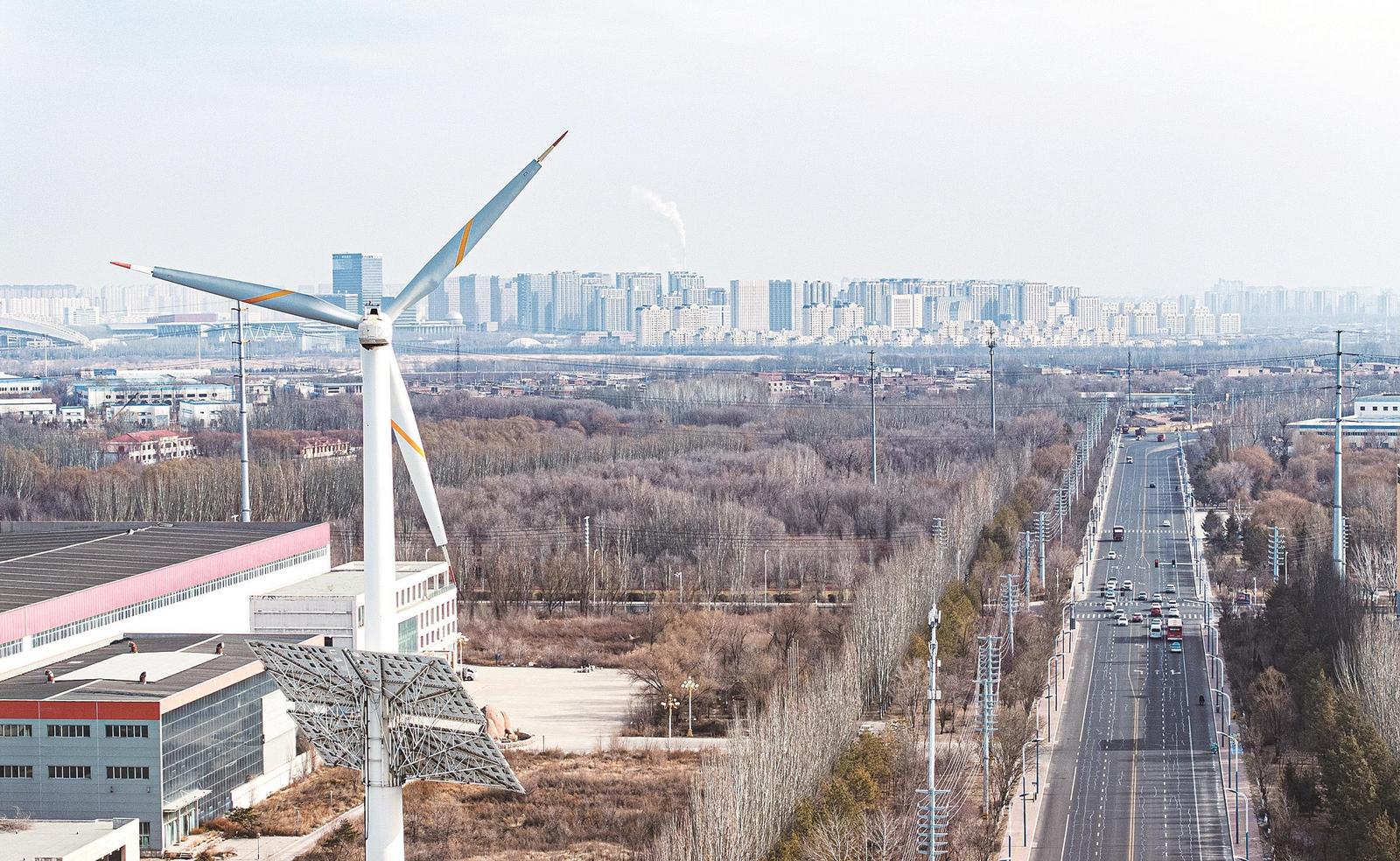 1月27日,鹿城街头,“风力发电机”与城市高楼错落同框、相映成趣,构成一幅美丽的冬日画卷。