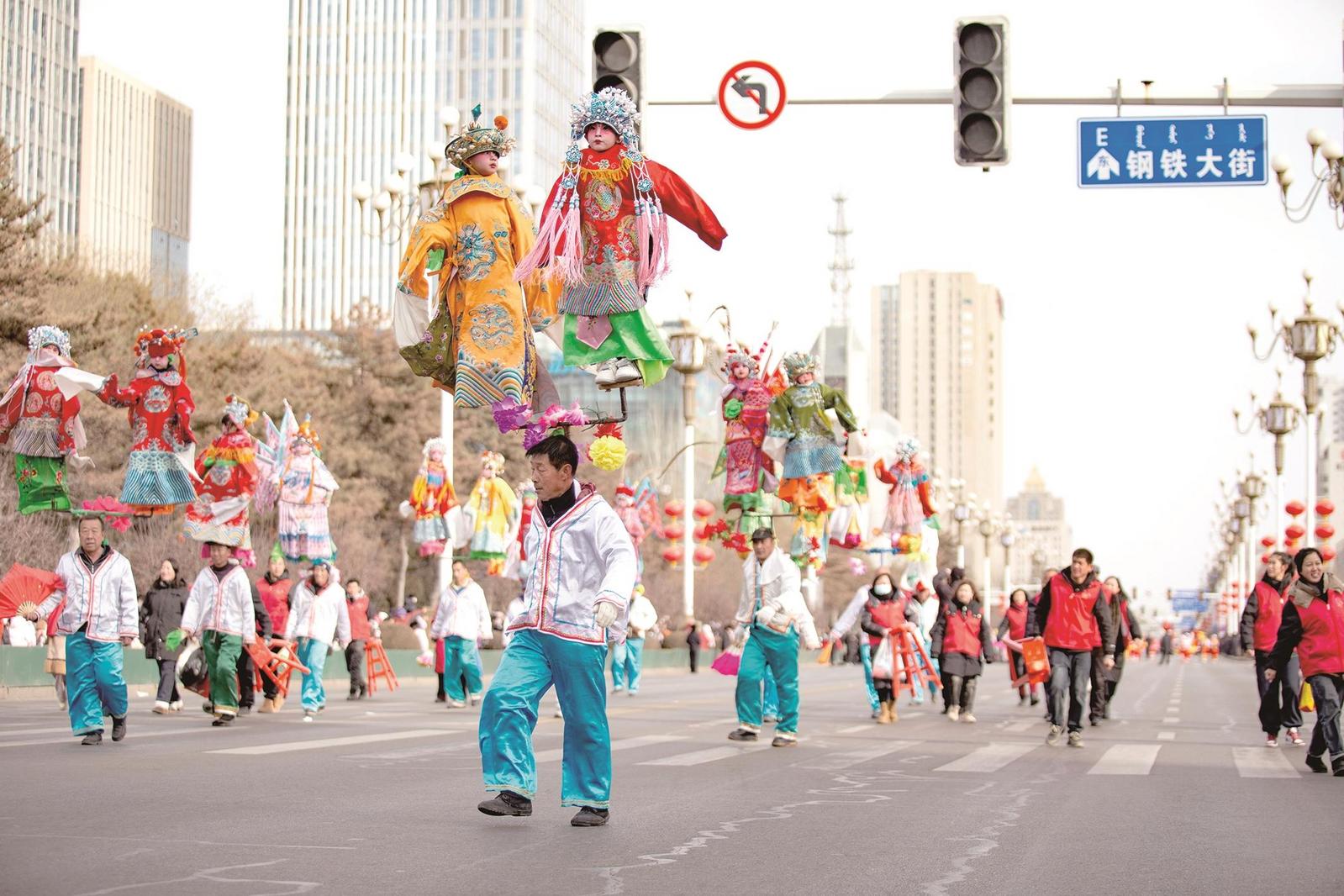 外来务工人员组建高跷、脑阁队进行节日表演。