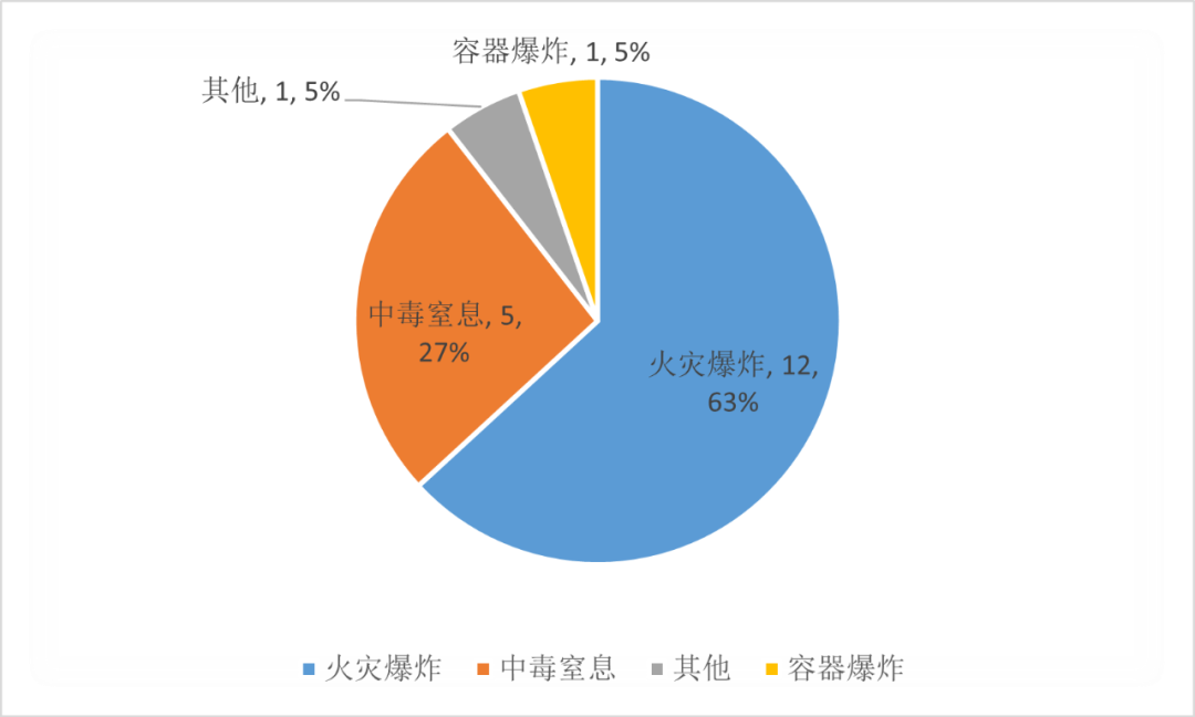 经分析,19起事故中,由于人的不安全行为造成的安全生产事故发生了12起,占63%,主要存在违章指挥、违章作业、违反操作规程等行为;设备安全因素引发的事故2起,占11%,主要存在设计缺陷、泄露等问题;因违反相关管理制度、操作规程等方面因素引发的事故5起。