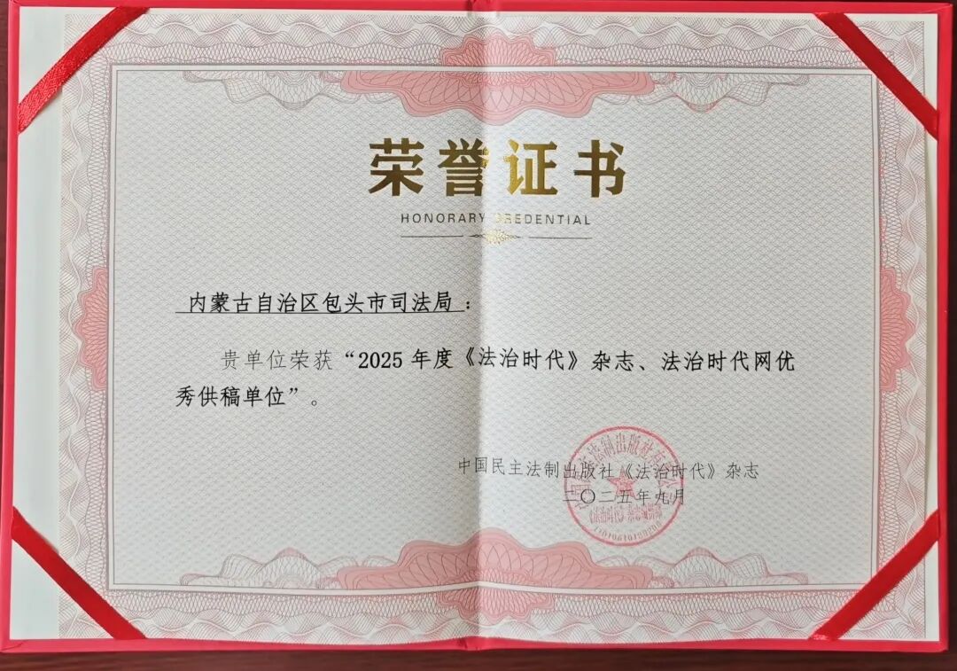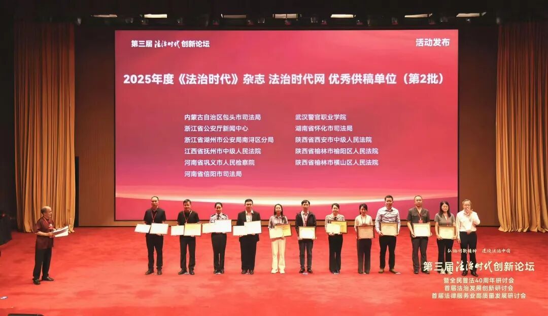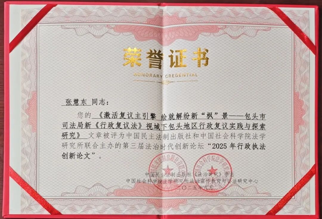 在第三届法治时代创新论坛上,包头市司法局申报的《激活复议主引擎 绘就解纷新枫景——新<行政复议法>视域下包头地区行政复议实践与探索研究》和内蒙古飞驰司法鉴定所申报的《声像资料与汽车痕迹物证的协同运用》两篇论文在1000多件案例、论文中脱颖而出,成功入选“2025年度法治创新论文”,同时包头市司法局荣获《法治时代》杂志、法治时代网优秀供稿单位称号。