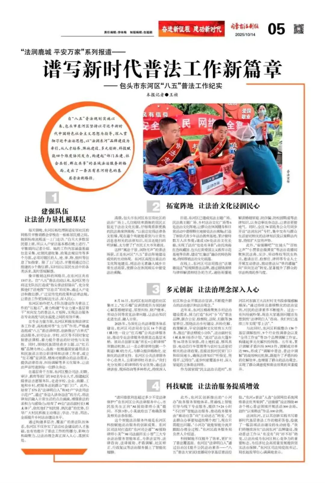 自“八五”普法规划实施以来,包头市东河区坚持以习近平新时代中国特色社会主义思想为指导,深入贯彻习近平法治思想,以“法润东河”品牌建设为牵引,从人才培养、阵地建设、多元创新、科技赋能四个维度协同发力,构建起“部门共建、社会共创、群众共享”的县域法治服务新格局,走出了一条具有东河特色的基层普法新路径。