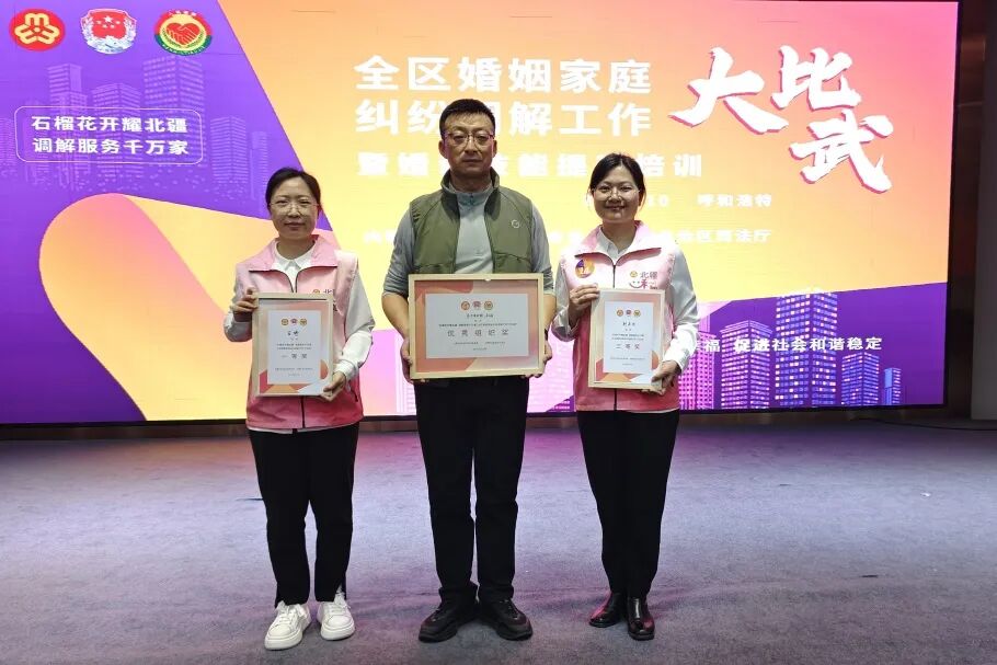 经过激烈角逐,来自包头市昆区少先路街道婚姻家庭纠纷调解室调解员王琦,凭借扎实的理论功底和出色的现场发挥,荣获个人一等奖,包头市土默特右旗诉前调解人民委员会调解员钟嘉丽荣获个人三等奖,包头市妇联、市司法局荣获优秀组织奖。
