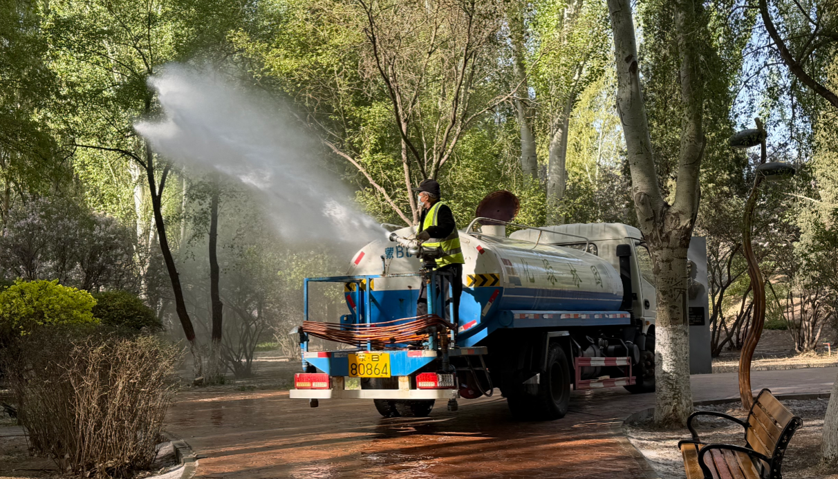 包头洒水车上路往杨柳树上喷水,压飞絮同时还防火