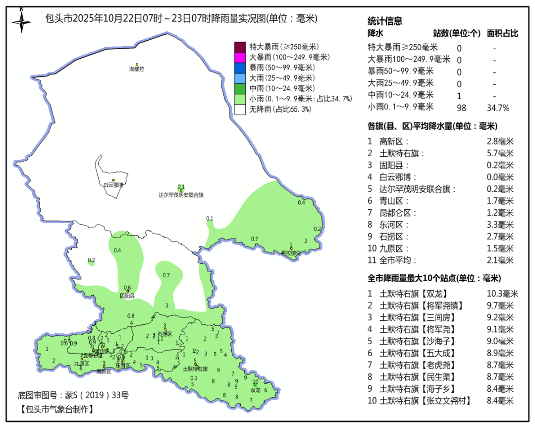 包头市气象局今日7时发布降水实况信息:10月22日7时至23日7时,我市市区、土右旗、固阳县、达茂旗东南部出现雨或雨夹雪天气,最大降水量出现在土默特右旗双龙为10.3毫米,最大小时雨强出现在土默特右旗将军尧镇张立文尧村22日16时至17时为4.3毫米。