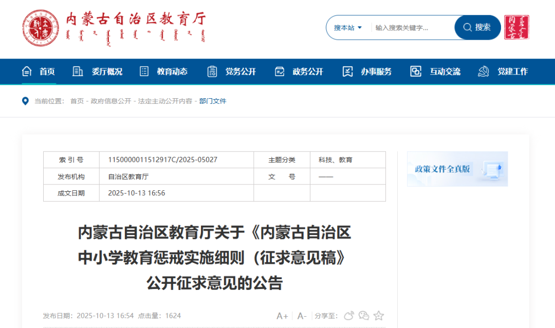10月21日,记者从内蒙古自治区教育厅了解到,为广泛听取社会各界的意见和建议,正式就《内蒙古自治区中小学教育惩戒实施细则(征求意见稿)》面向社会公开征求意见。详情