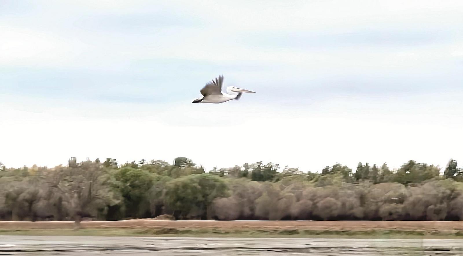 飞翔中的卷羽鹈鹕。(图由市湿地保护中心提供)