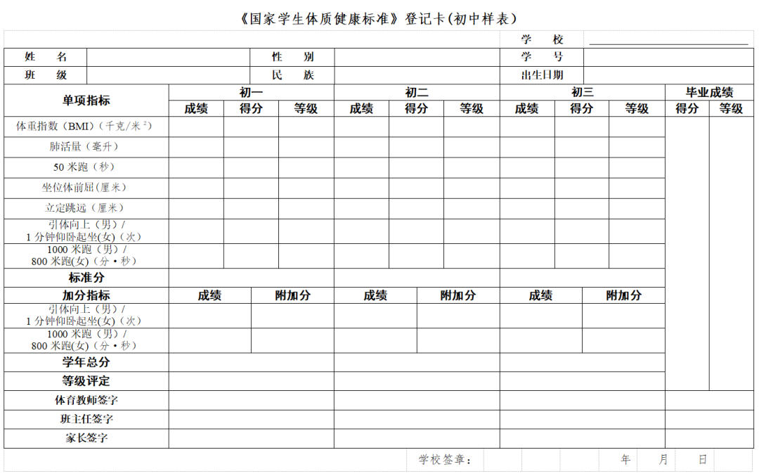 在内蒙古自治区内就读的考生,需提供旗县区及以上招生考试机构出具的初中各年度体育测试成绩证明;内蒙古自治区外就读的考生,需提供就读学校出具的初中各年度国家学生体质测试成绩卡(样表见附件2)。以上材料均需加盖出具单位的公章,在中考报名现场确认时交我市旗县区考试中心。